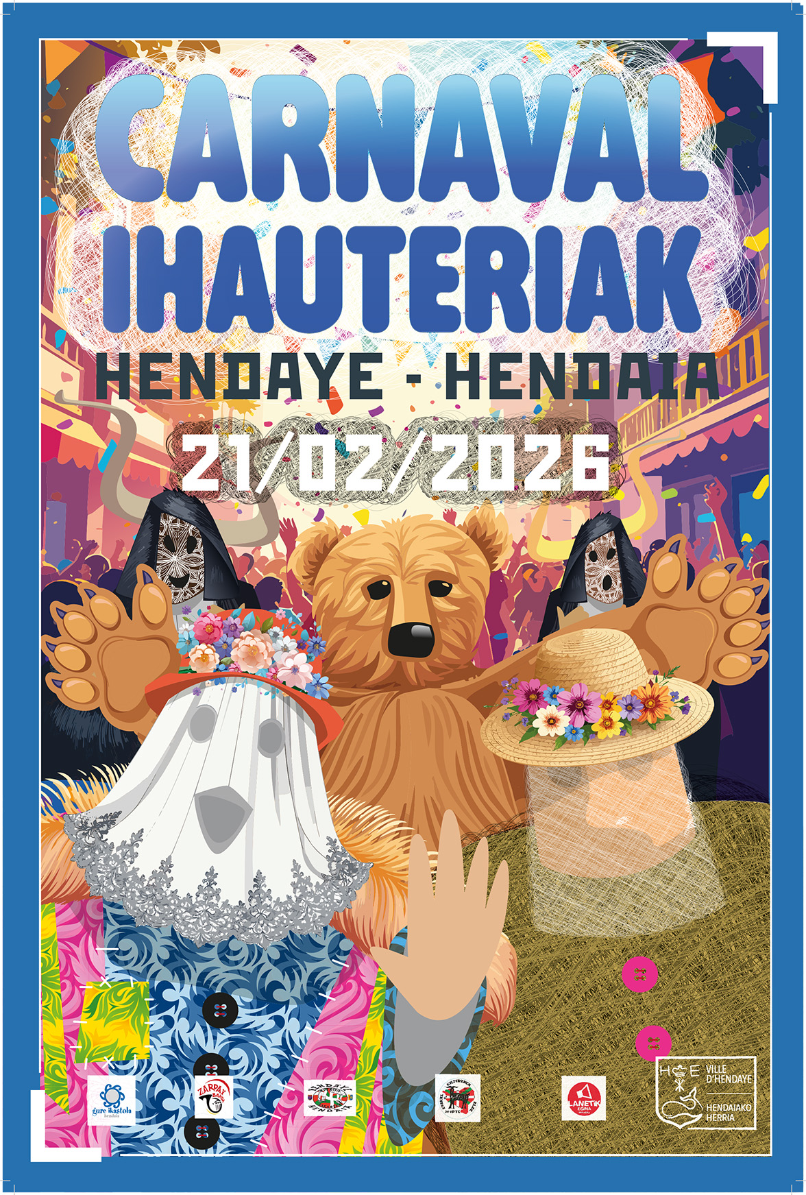 - 16:00 Rassemblement des groupes, des bandas (Akelarre, Mutxiko Elkartea, Patxaranga, Zarpai Banda, marionnettes géantes de la Cie Kilika, Cie Trabudu » Carnaval des Oiseaux ») et des chars des associations (la bande a Sorgina, Zarpai Banda, Euskal Dantza).